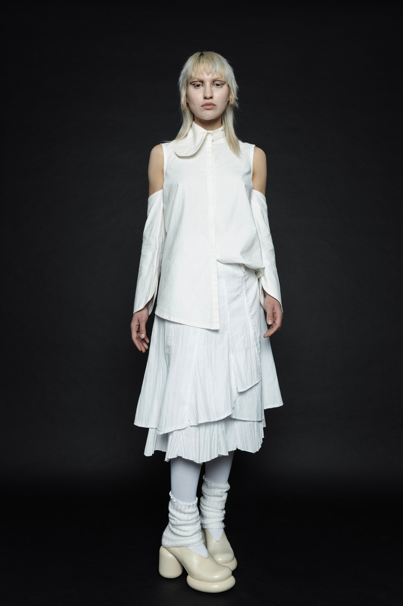 100% cotton shirt with asimmetrical round collar and low-cut sleeves.
